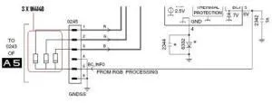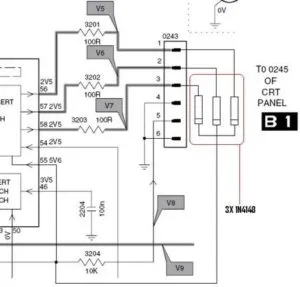 Pensei: “- Vamos por em prática para ver se funciona”. Então coloquei uma famosa 29PT4631 na bancada e fiz a alteração, mas não obtive sucesso, ou seja, continuou desligando do mesmo jeito. Pode ser também que o cinescópio da tv na qual ele efetuou o teste estava melhor do que o meu. Monitorei todo funcionamento com o osciloscópio e cheguei à seguinte solução: liguei os catodos dos mesmos três diodos 1N4148 em outro ponto, e aí sim eu obtive sucesso, podendo então deixar o screen no mínimo que ela continuava com alta sem se desligar. Elevando o screen ao máximo não desligava também.