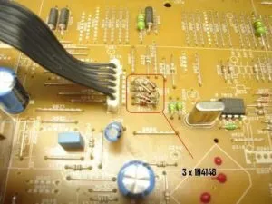 Pensei: “- Vamos por em prática para ver se funciona”. Então coloquei uma famosa 29PT4631 na bancada e fiz a alteração, mas não obtive sucesso, ou seja, continuou desligando do mesmo jeito. Pode ser também que o cinescópio da tv na qual ele efetuou o teste estava melhor do que o meu. Monitorei todo funcionamento com o osciloscópio e cheguei à seguinte solução: liguei os catodos dos mesmos três diodos 1N4148 em outro ponto, e aí sim eu obtive sucesso, podendo então deixar o screen no mínimo que ela continuava com alta sem se desligar. Elevando o screen ao máximo não desligava também.